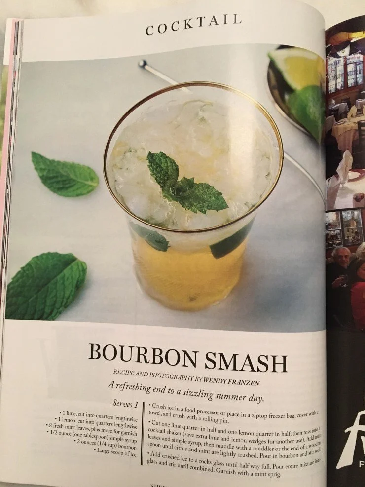 The August issue of Sheridan Road hit mailboxes yesterday. It brings me so much joy to create cocktails and recipes for the magazine each month, and choosing what to make is a big part of the fun. The magazine's fabulous editor (and I'm not just saying that - she really is a dynamo), Dustin O'Regan, will share with me the stories she plans to feature, providing a springboard for ideas. From there I develop recipes that marry what's happening in the magazine with ingredients that highlight the current season. This month's issue has country music artist Elizabeth Lyons on the cover, which led me to the sizzling South for inspiration. Bourbon and peaches were natural choices, so I made an icy Bourbon Smash and a classic peach cobbler. I have to admit, I still do a sort of half-skip to the mailbox when I know it's there waiting.