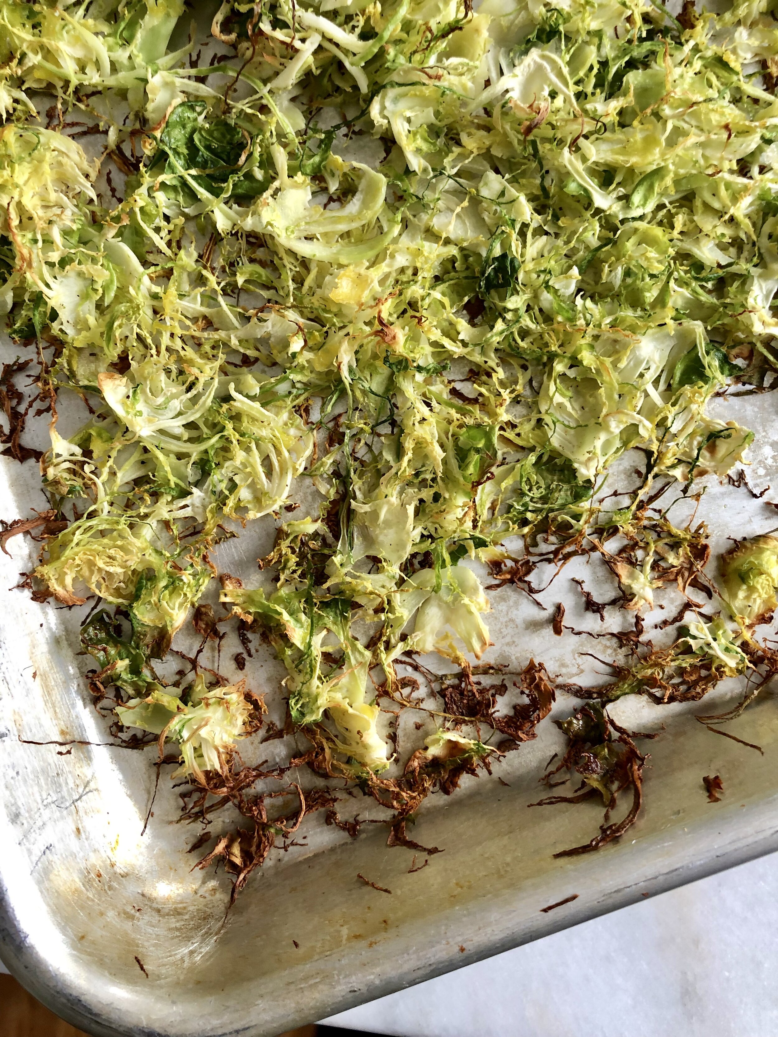 Using a food processor fitted with a slicing disc or a mandolin (or a very sharp knife and loads of patience), thinly slice Brussels sprouts then place in a large bowl. Drizzle with 3 tablespoons olive oil, season with 3/4 teaspoon salt and 1/2 teaspoon pepper, tossing gently with your hands to coat.Spread shaved sprouts evenly between two sheet pans, creating a thin, even layer on each. Do not crowd onto one pan - you don't want the sprouts to steam.